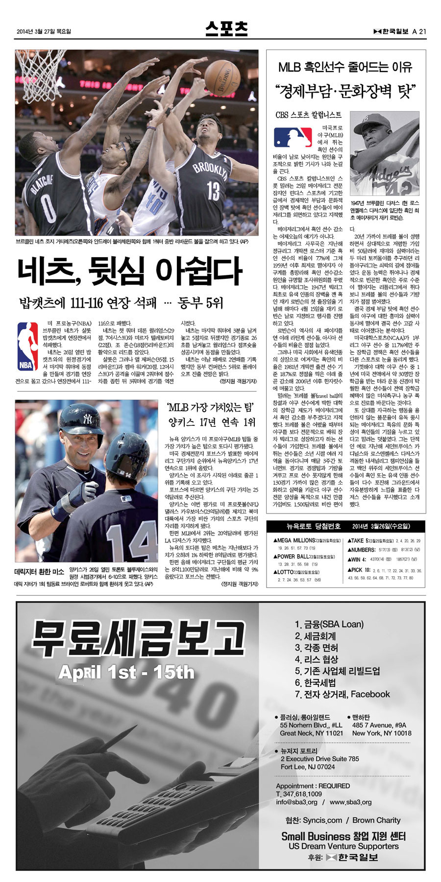 소상인들을 지원하는 비영리단체 ‘스몰비즈니스창업지원센터(대표 문휘섭)’가 내달 5일부터 18일까지 뉴욕한국일보 후원으로 개인 및 업주들을 위한 무료 세금 보고 대행 서비스를 실시한다.